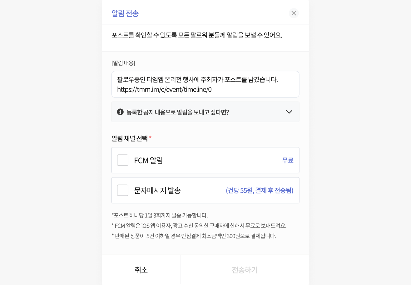 등록한 공지 내용 전체를 전송하기 위해서는 문자 메시지 전송 대행 서비스를 이용해주세요.