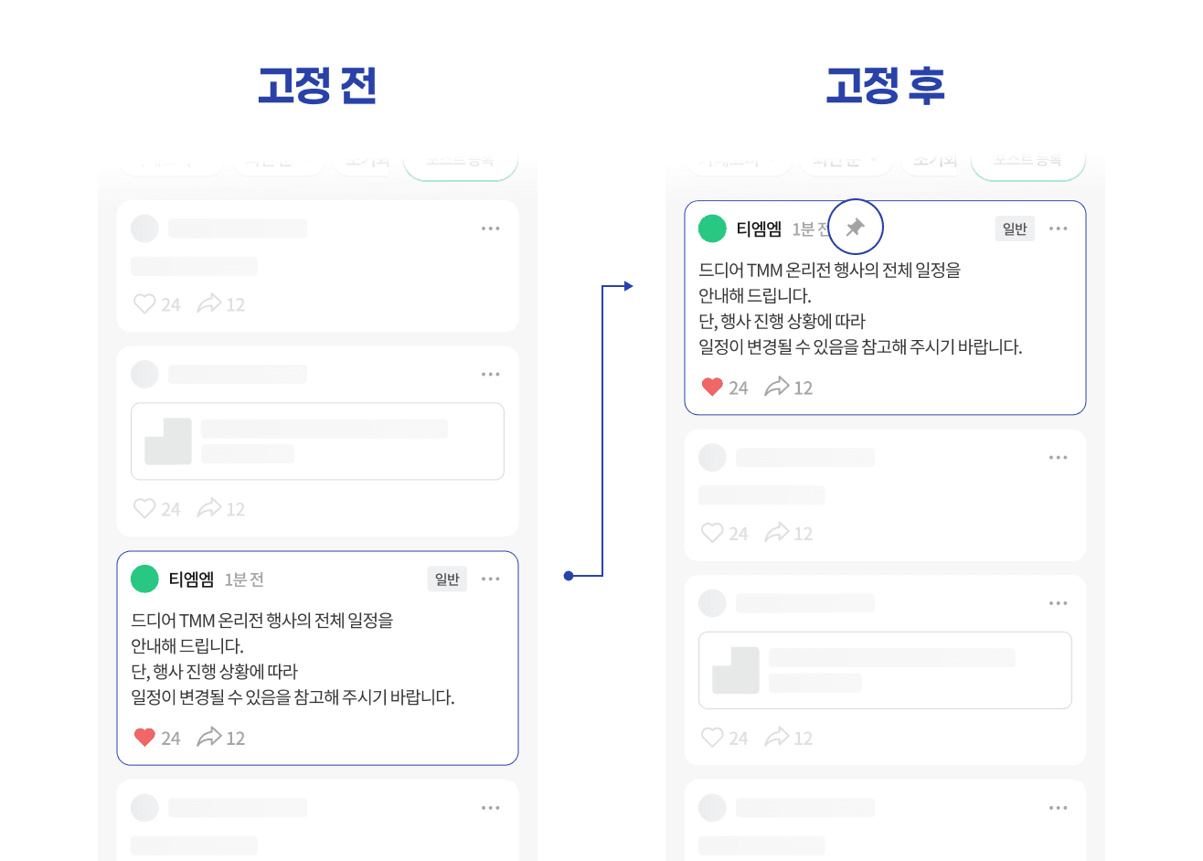 주최자는 원하는 포스트를 최상단에 3개까지 고정할 수 있습니다. 고정된 포스트는 언제든 해제할 수 있습니다.
