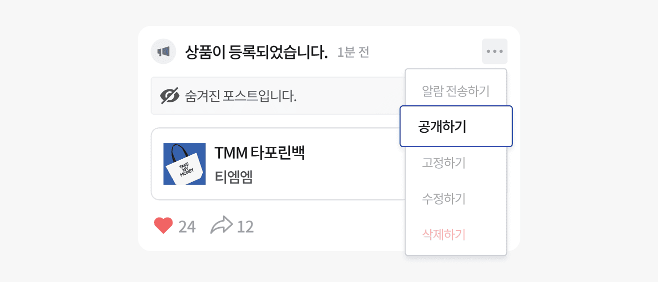 숨겨진 포스트는 주최자의 계정에서만 확인할 수 있으며 언제든 공개할 수 있습니다.