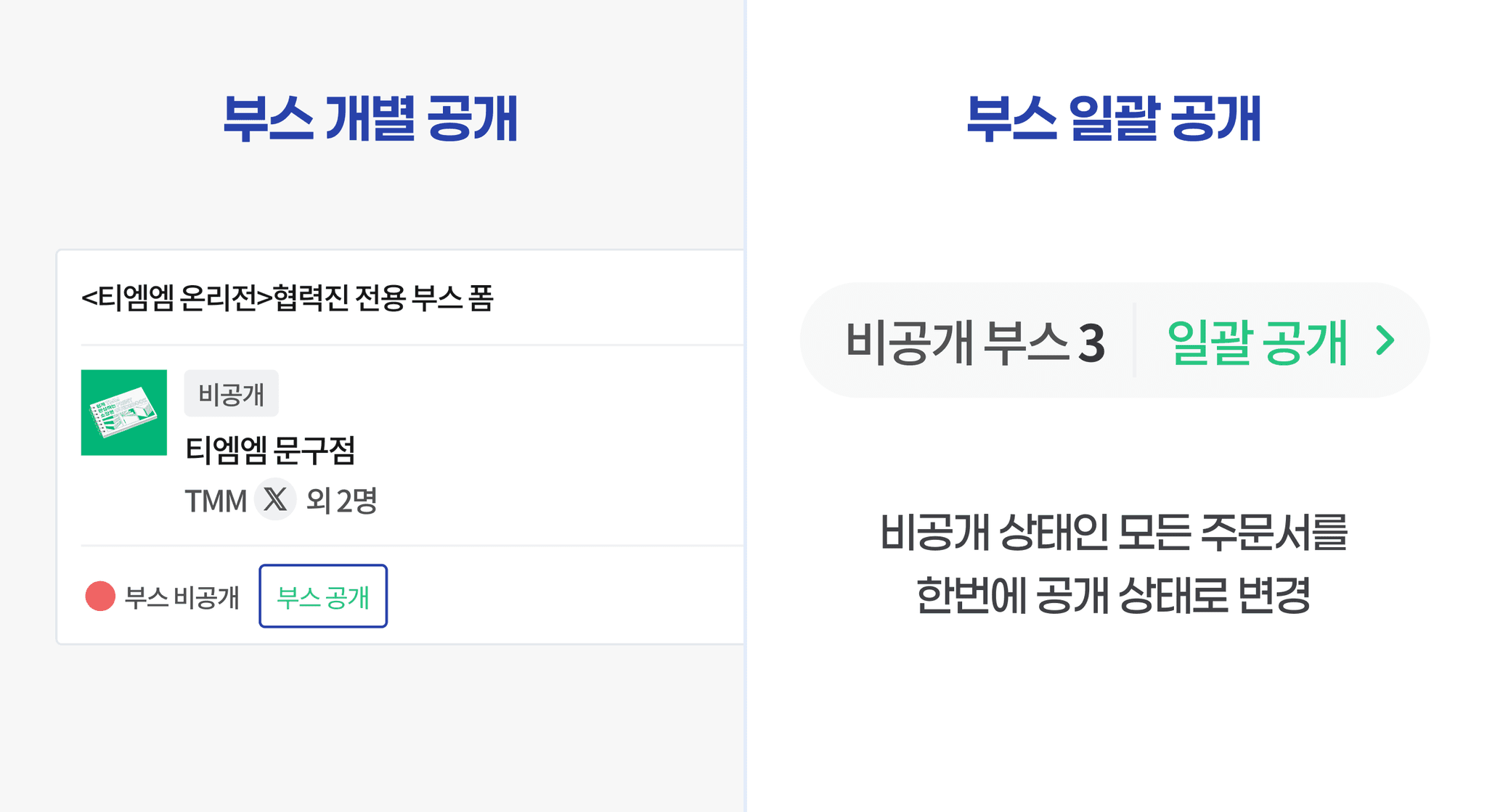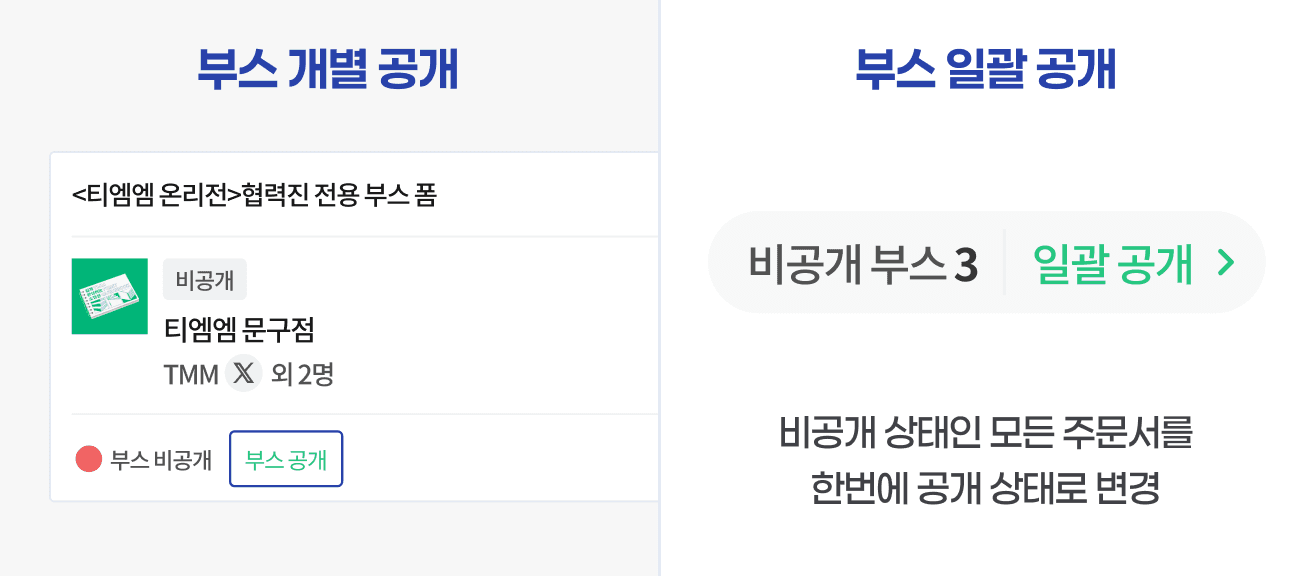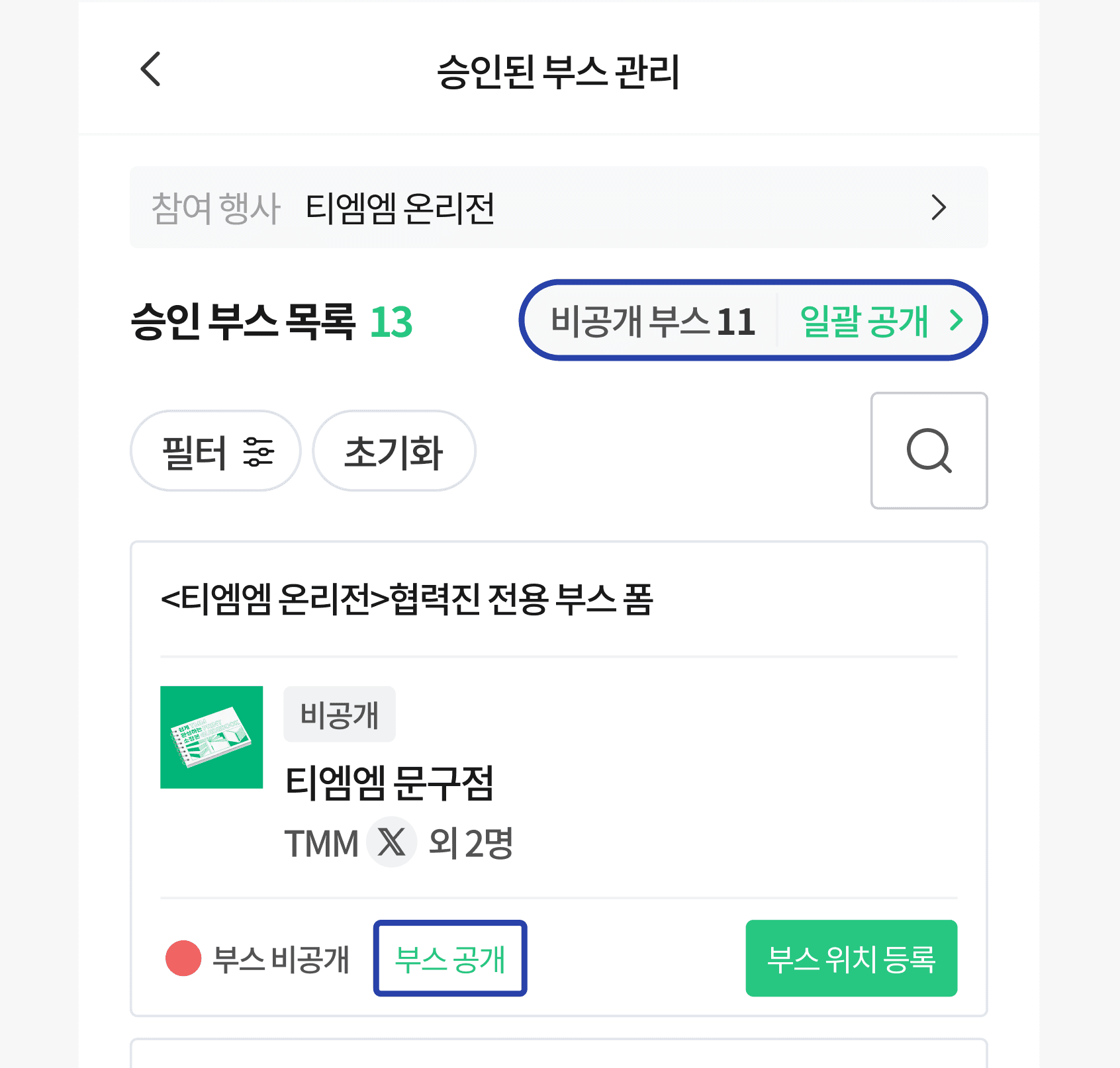 '일괄 공개'를 클릭하여 비공개 상태인 부스를 모두 공개로 전환할 수 있습니다.