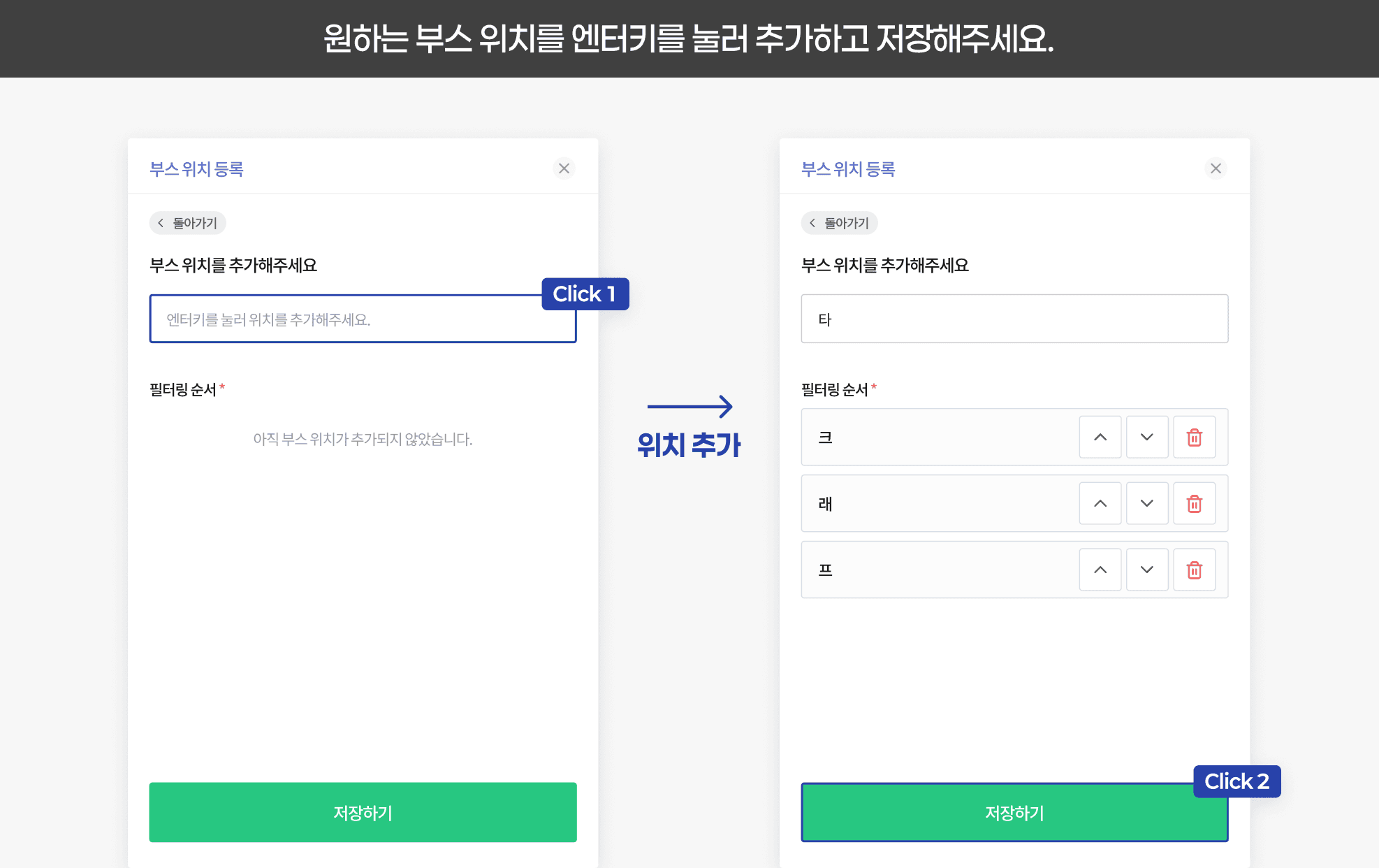 부스 위치 등록 버튼을 클릭하여 각 부스의 위치 및 번호를 지정해주세요.
