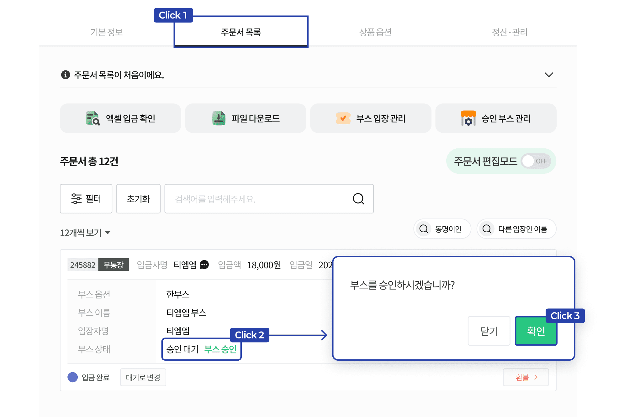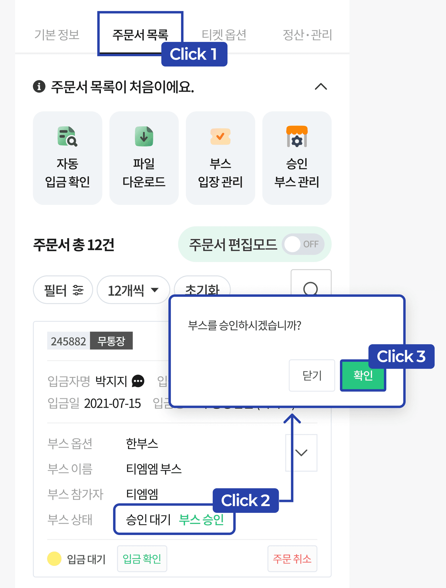 * 부스 승인은 입금 완료 혹은 결제 완료 상태인 경우에만 가능합니다.