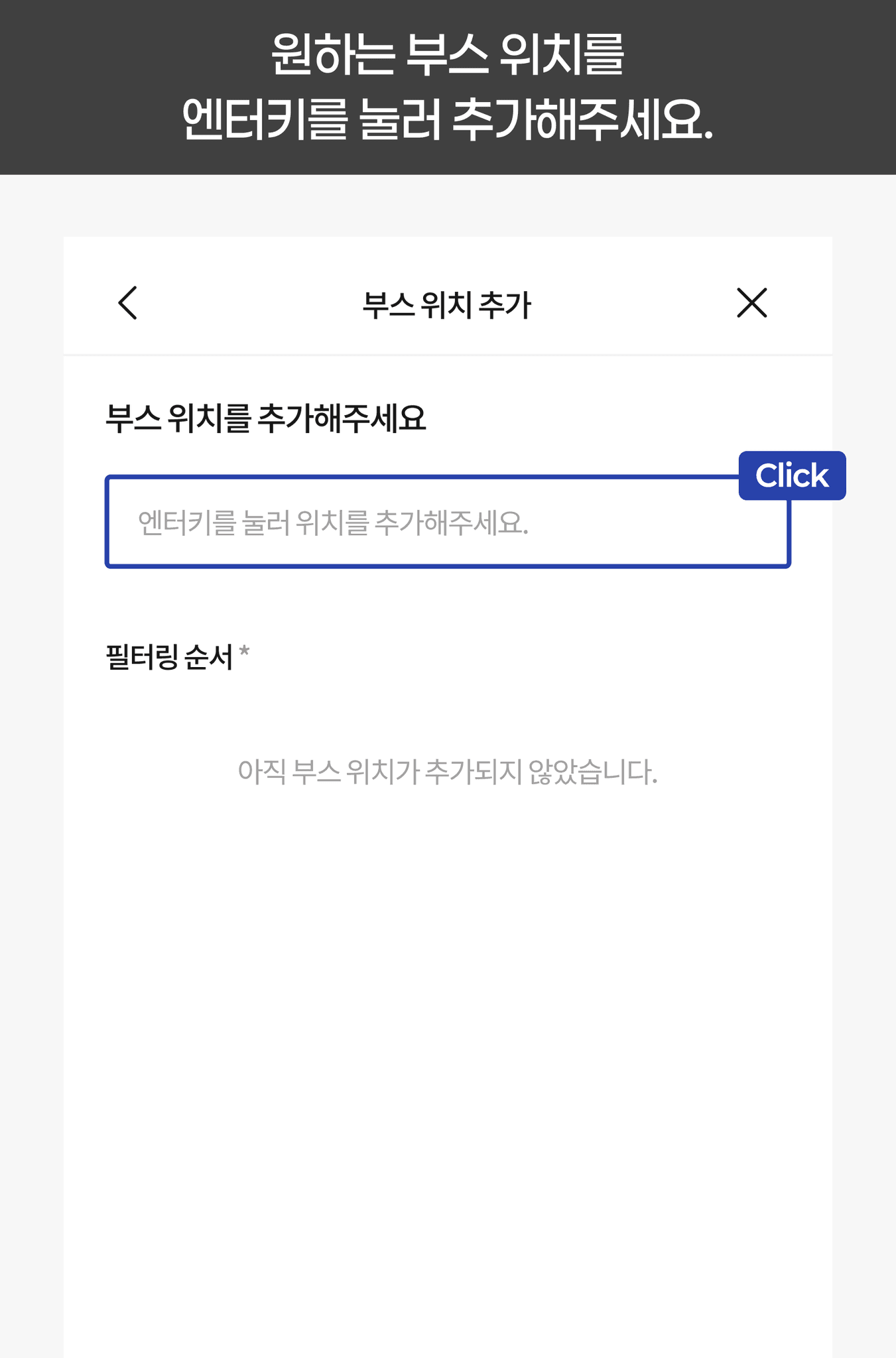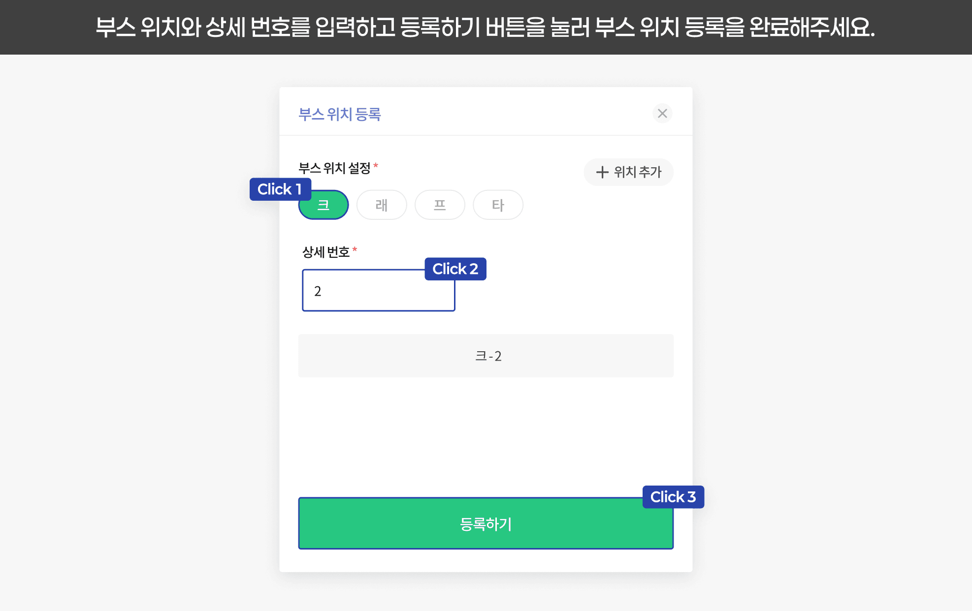 * 설정된 위치가 없는 경우, ‘등록하기’버튼이 비활성화되며 부스 번호를 지정할 수 없습니다.