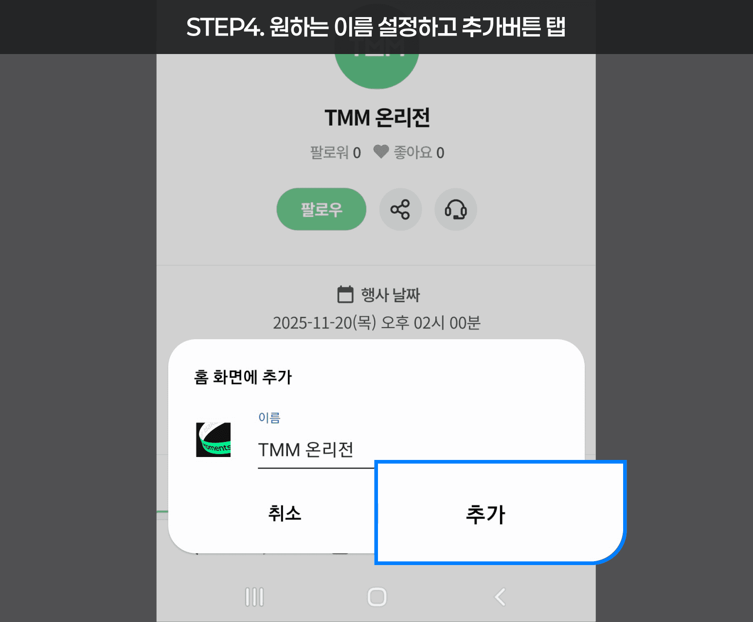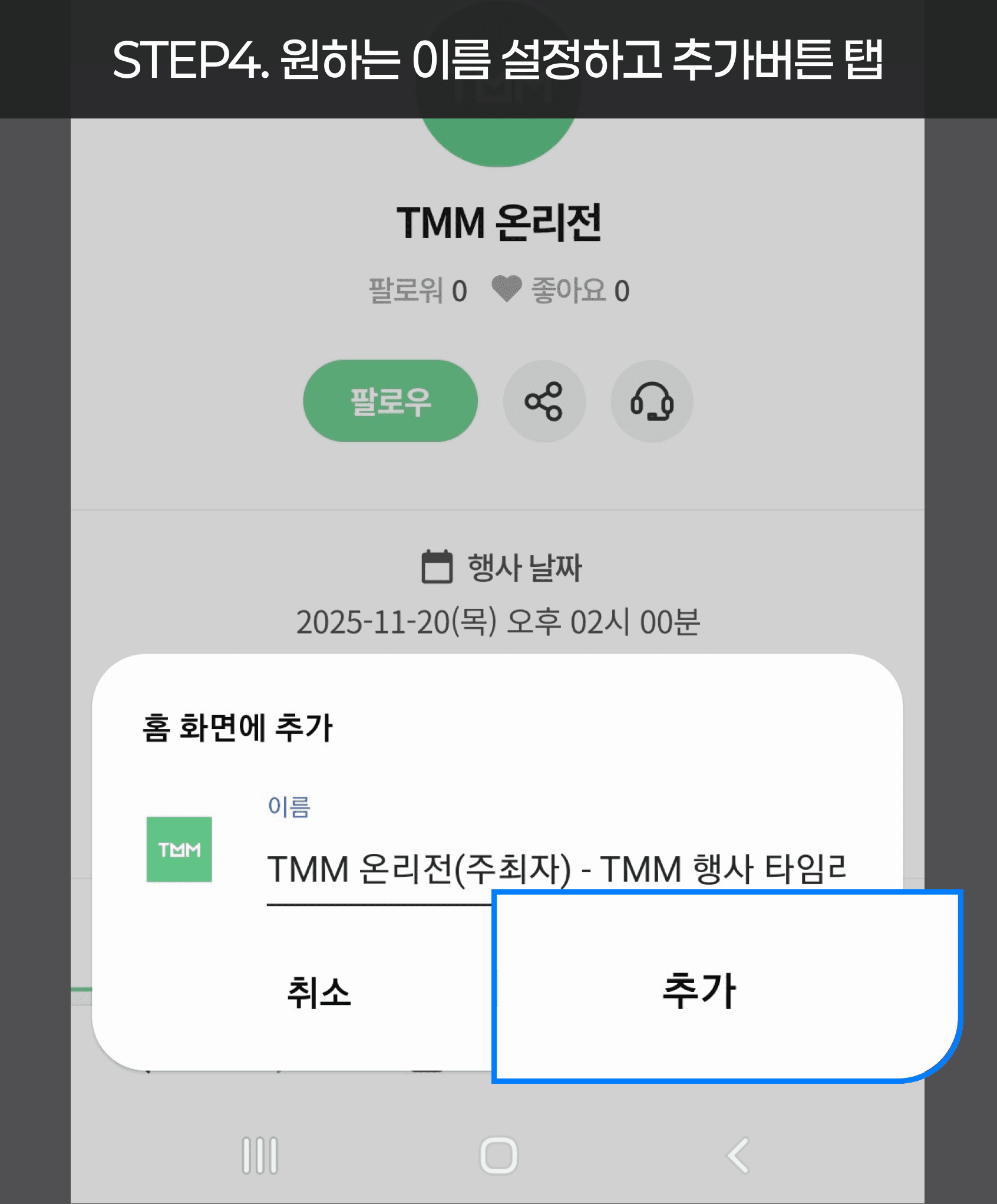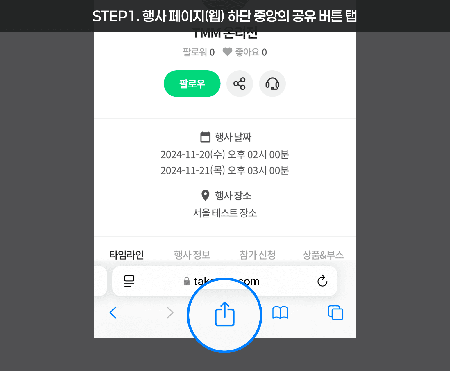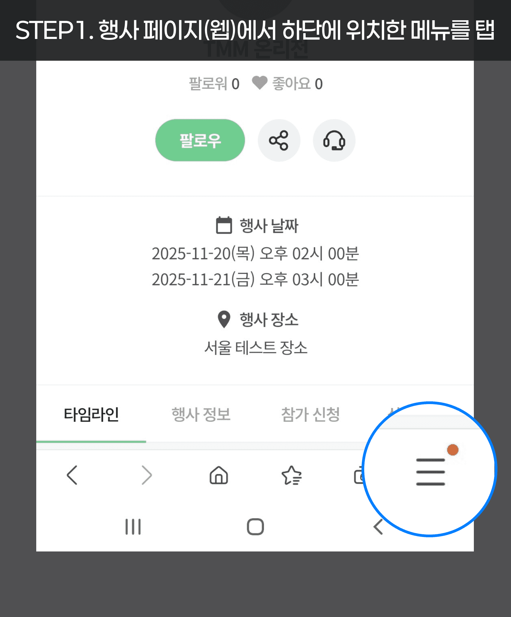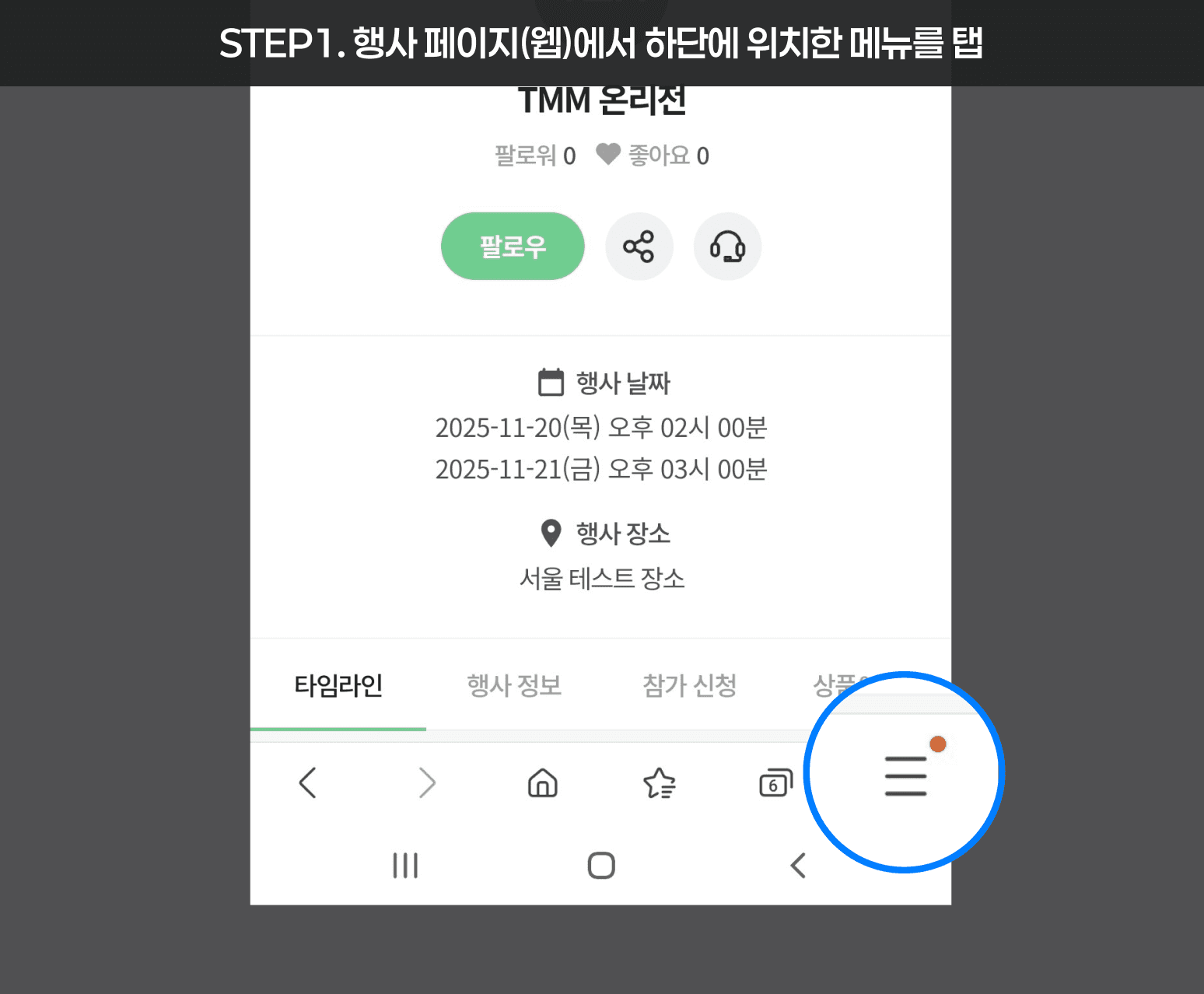 모바일에서 페이지 열기: 모바일 기기 > 브라우저에서 해당 행사 페이지를 웹으로 엽니다. (TMM앱에서 불가)