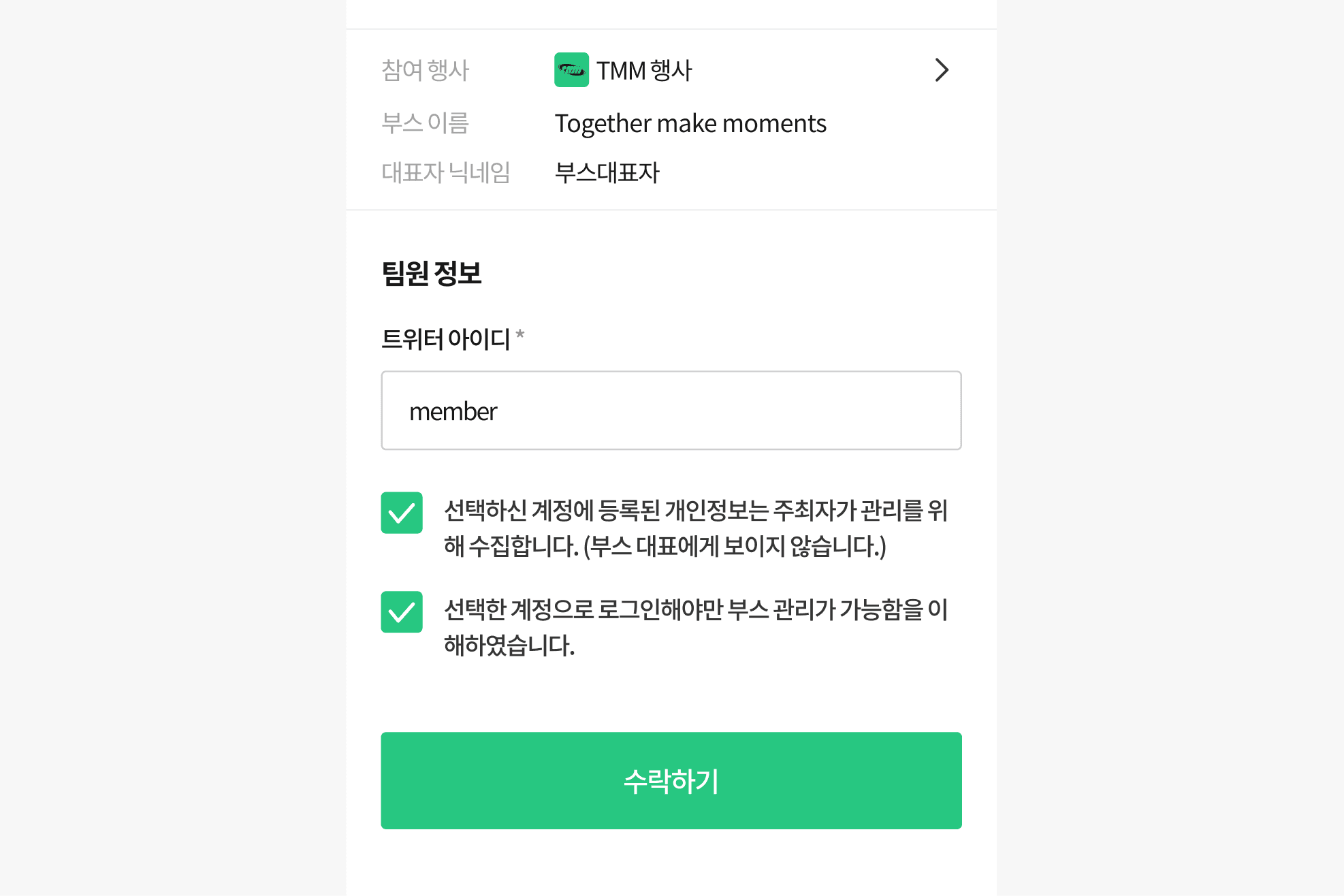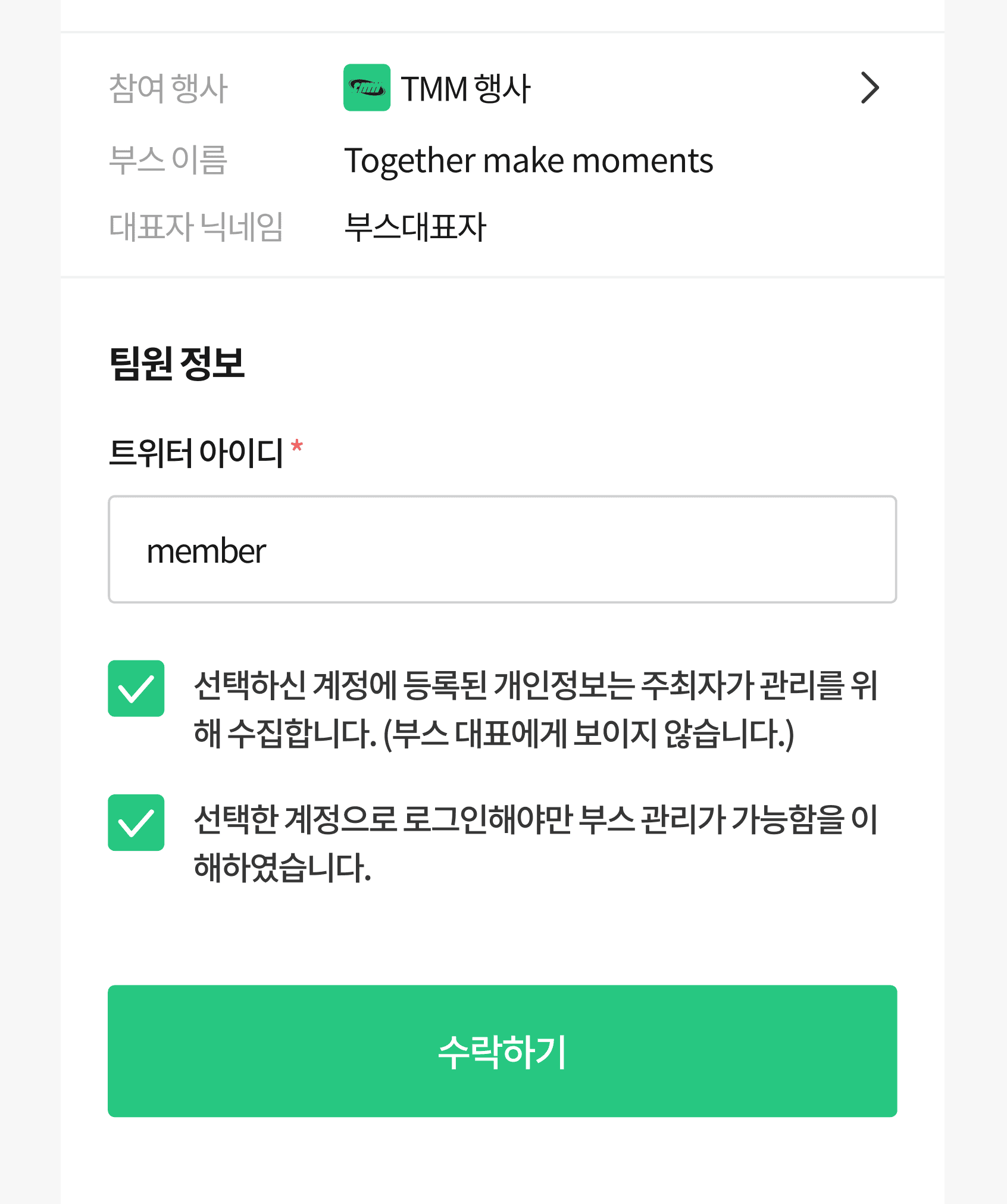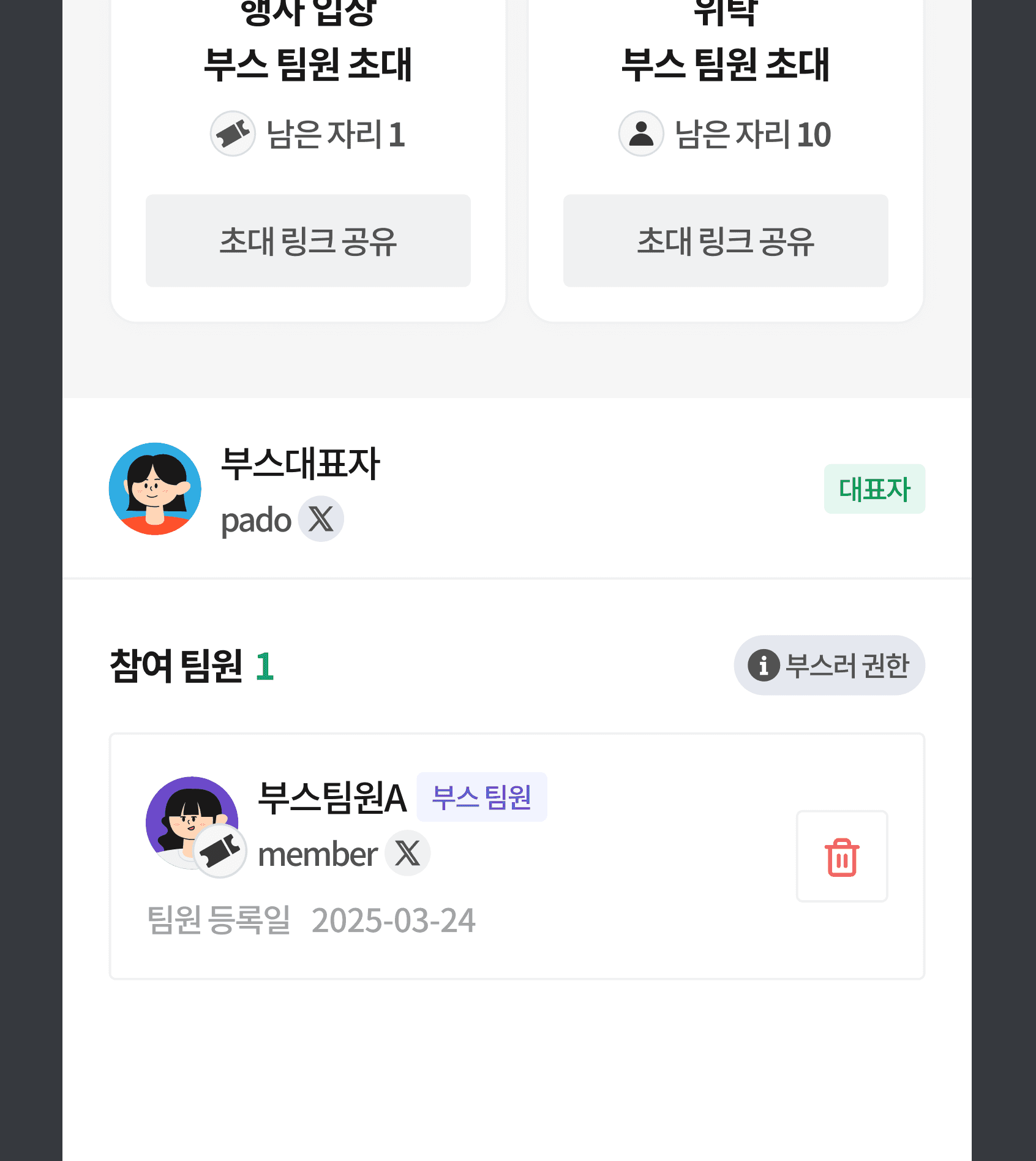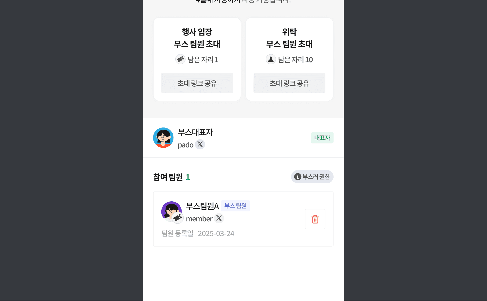 팀원은 대표자와 동일한 권한을 부여받아 부스에 참여할 수 있습니다. 주요 권한은 다음과 같습니다.