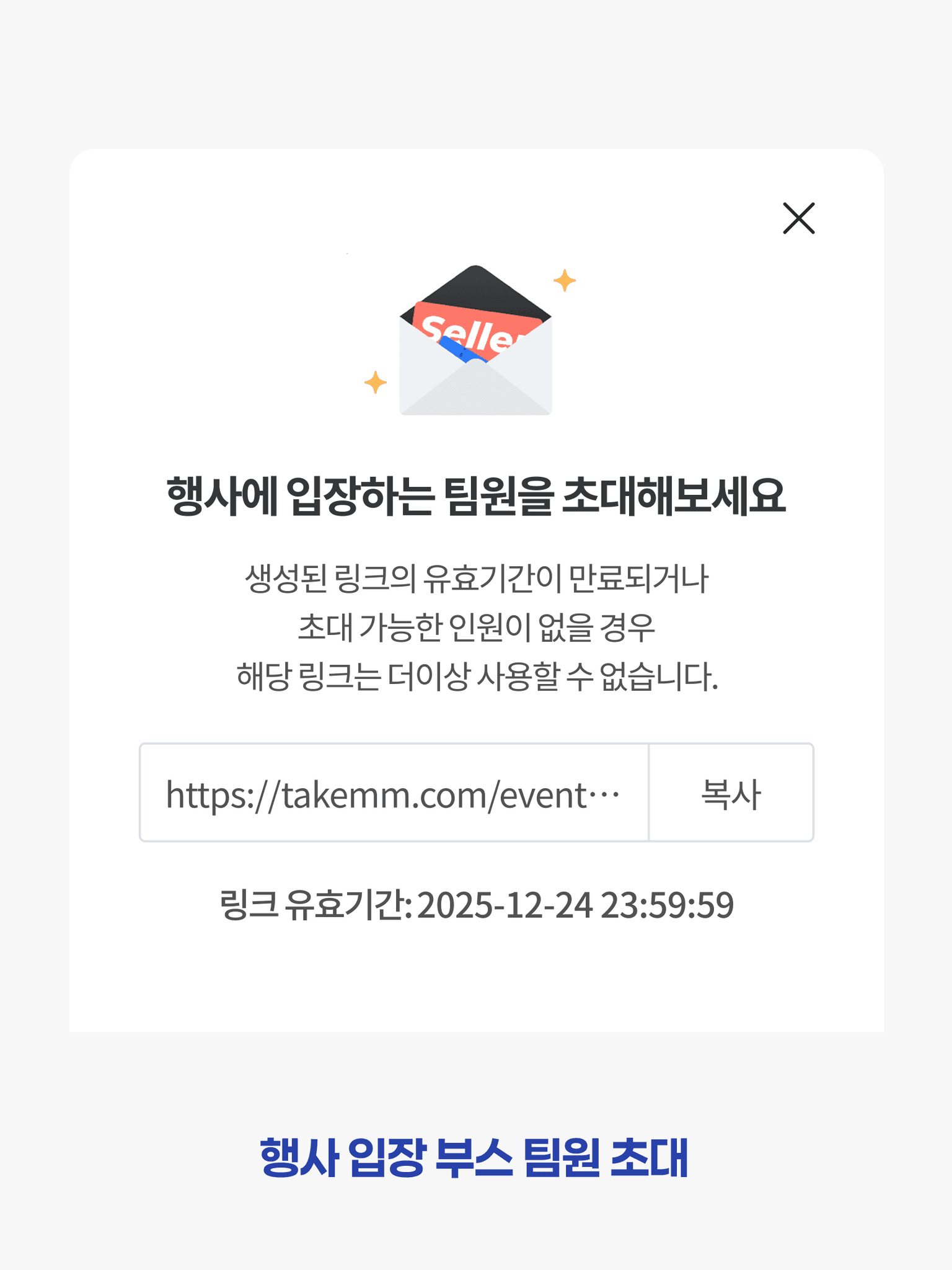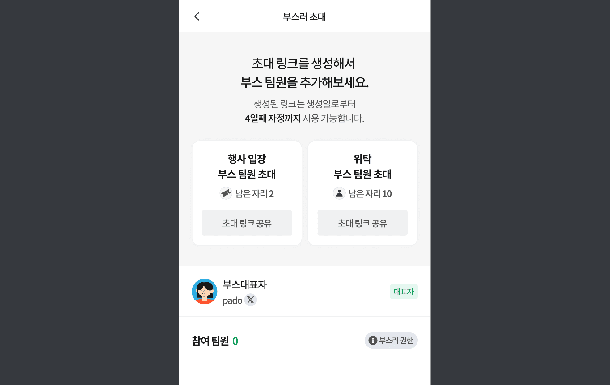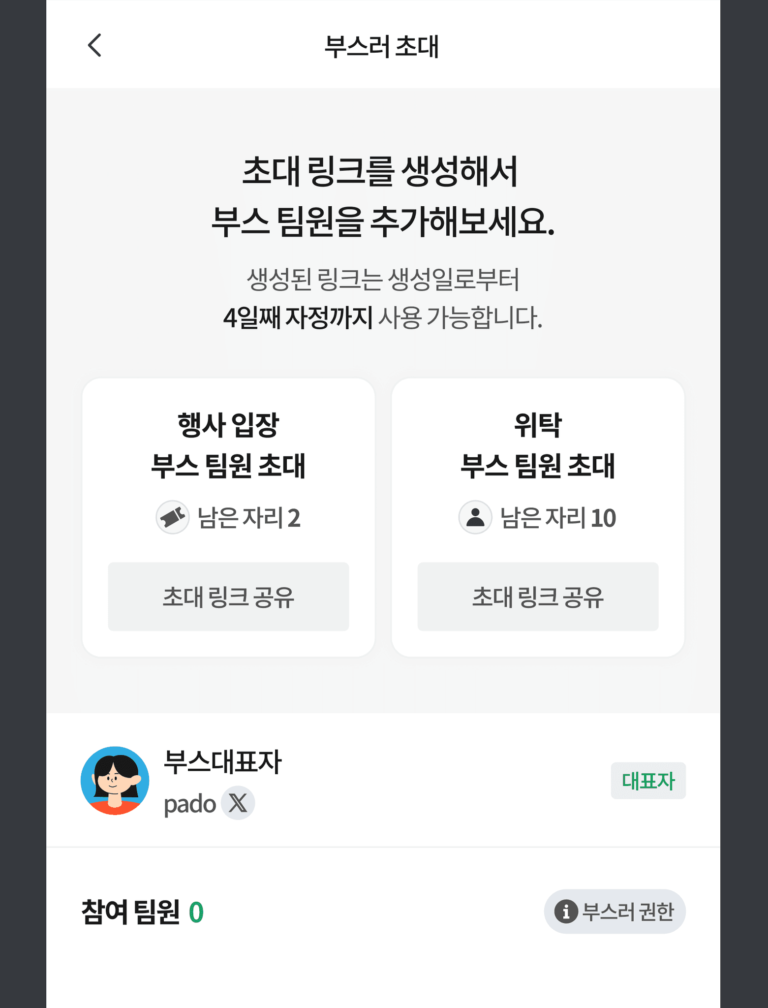 초대 링크를 생성해서 부스팀원을 추가해보세요! 이 가이드에서는 함께 부스를 운영할 팀원을 초대하고, 참여 팀원 목록을 확인 및 관리하는 방법을 안내해드립니다.