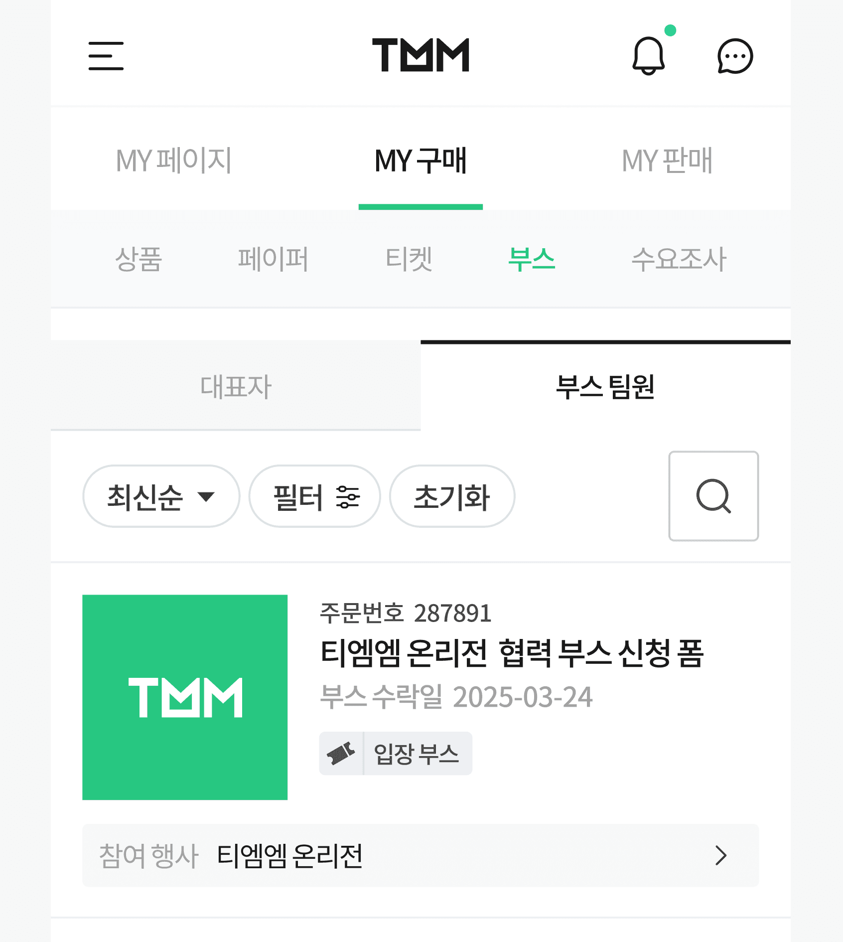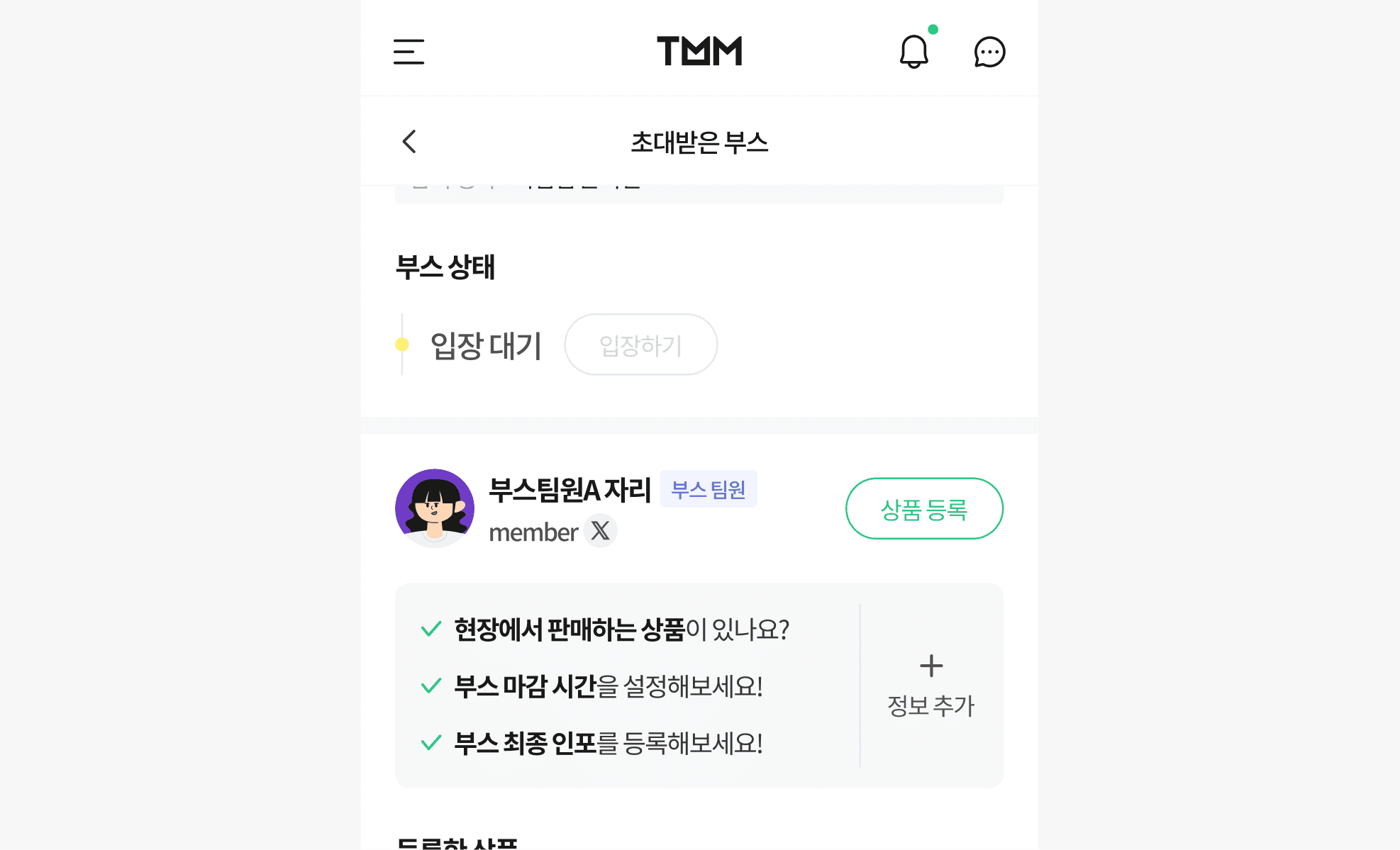 해당 팀원은 입장권을 통해 행사장 입장이 가능하며, 부스에 상품을 등록할 수 있습니다.