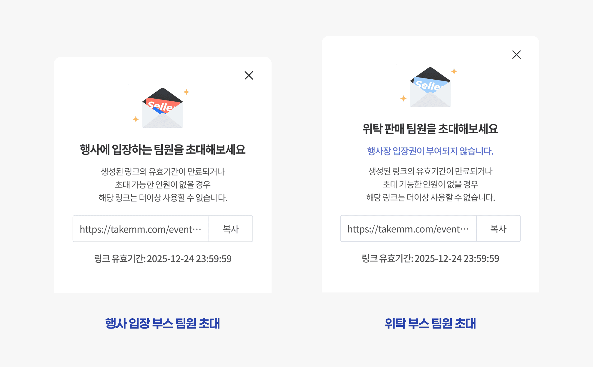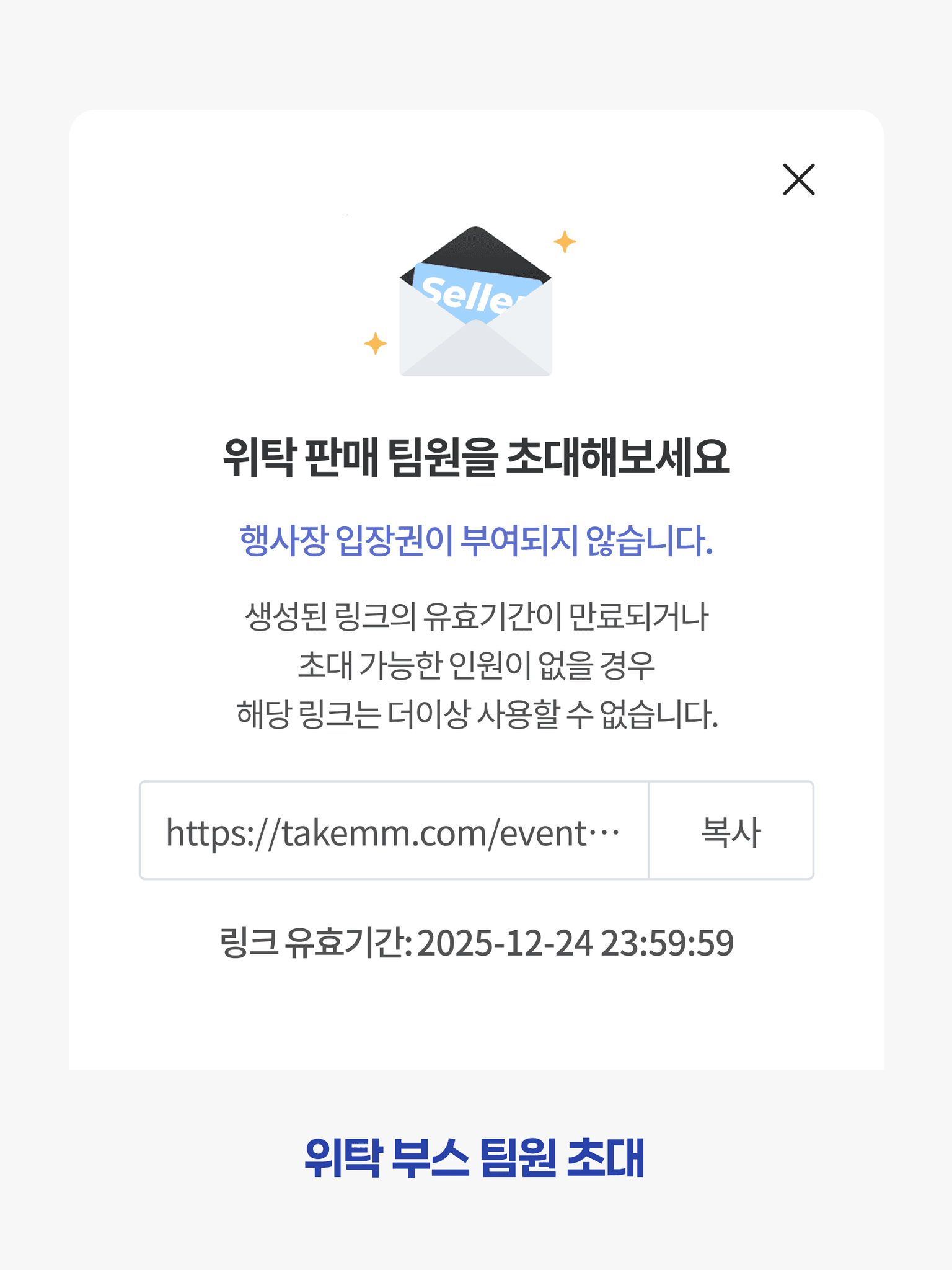해당 팀원은 입장권을 통한 행사장 입장은 불가하지만, 부스에 상품을 등록 할 수 있습니다.