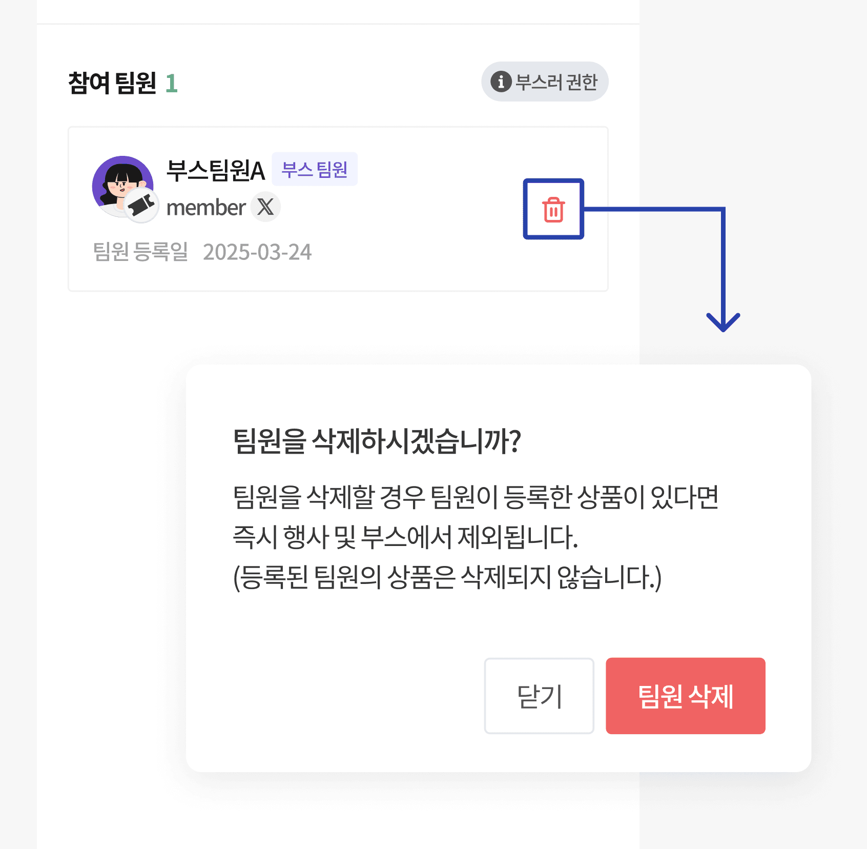 연동 해제: 상품을 등록한 팀원을 목록에서 삭제할 경우, 팀원 등록 및 상품 연동이 해제 됩니다.